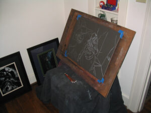 The mat board is taped to a sheet of Masonite. I tend to use this set up as my standard easel system. Kitchen chair, black cloak to protect the chair, and image taped to Masonite.