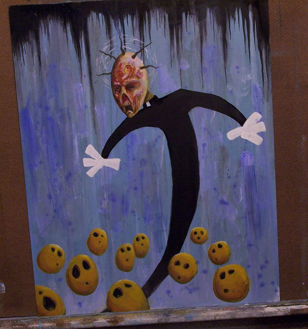 As far as art, I have been reworking one painting for a while now, it is about a quote I heard on the radio, saying that suffering is divine, it brings us closer to god. So therefore healthcare for all takes suffering away from the poor, which in turn takes away their road to heaven. It tore me up so badly, I immediately started sketching this painting. This painting is about anyone who uses their power and station for selfish reasons and does not care for those around them who need help.