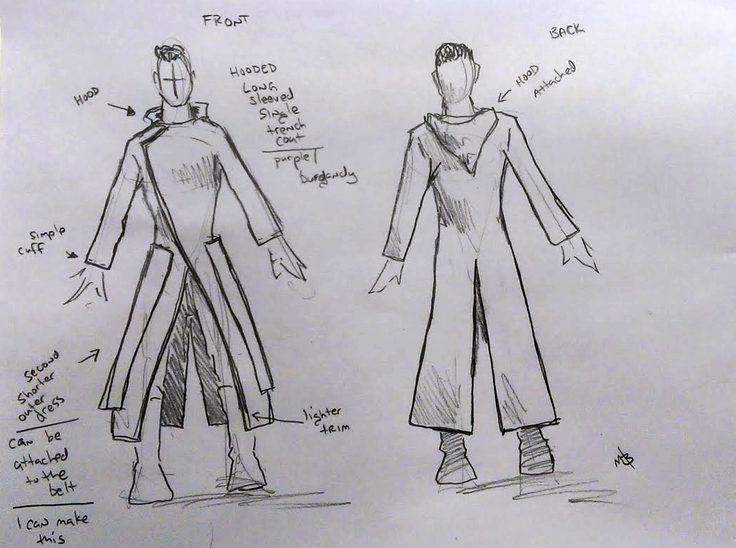 I thought a nice thick linen, dyed to the burgandy purple we see above. Plus I fee linen will have that nice worn in feel that his robe has. Whitney Evans, our elf ear costumer from the Ohio Renaissance Festival, has decided to help me create the robe. First thing, sketch time!