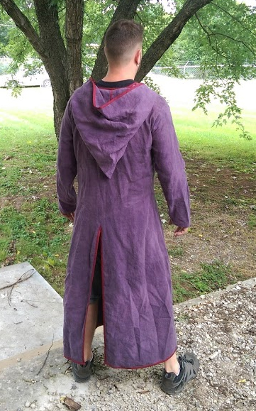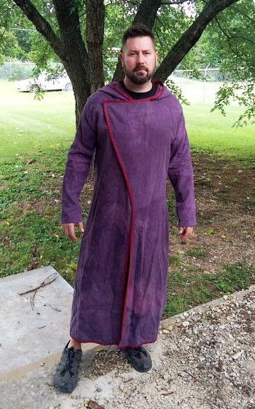 Made by our friend Whitney, the under robe is dyed linen with red bias tape trim. I mixed red, purple and a touch of black when dying it. I had some issues with the color not being even, but then I thought that Allanon’s robe would be pretty weather worn, so I figured it would be ok.