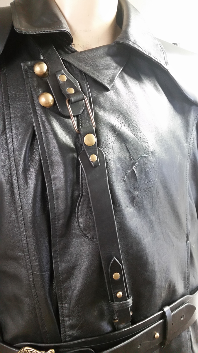 I decided to rivet the back portion of the shoulder strap directly to the jacket under the collar, that way I don’t have to worry about losing it, or it slipping off while wearing the costume. The rivet is completely hidden by the collar. The shoulder strap snaps to the waist belt in the back, and ends with an antique brass rectangular loop near the chest.