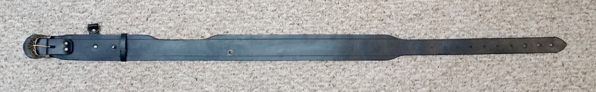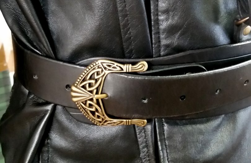 The next step was to make the belts. I started with the wider waist belt, since the other belts all have to attach to that as their foundation. I started with a 2.5 inch wide kilt belt, and carved the curved shape out of this single belt, as seen in the image above. The buckle end is rounded (see photo below), and the other end narrows to fit the 1 1/4″ buckle. While the show used a more simple buckle, I really liked this Celtic buckle from Tandy Leather. To me it matches the Elven architecture of both Shannara and T