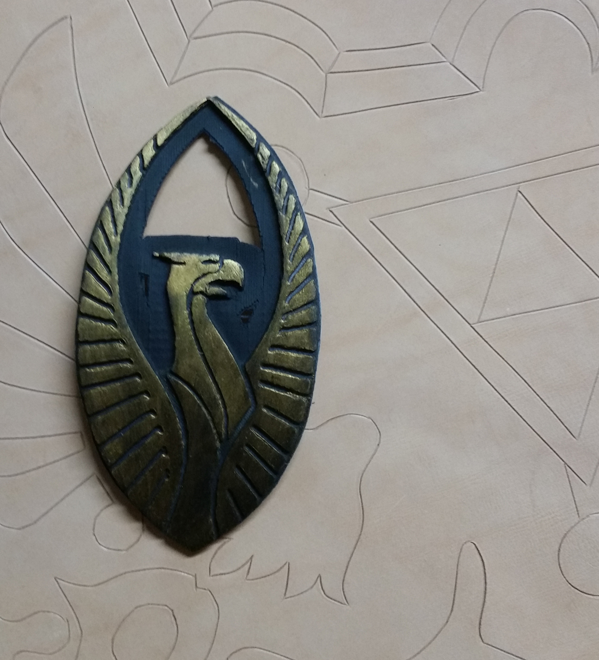 My original plan was to hand-tool a piece of leather to make the emblem. However, that would take a lot of time, and look a little rough compared to the show, in which the Griffin