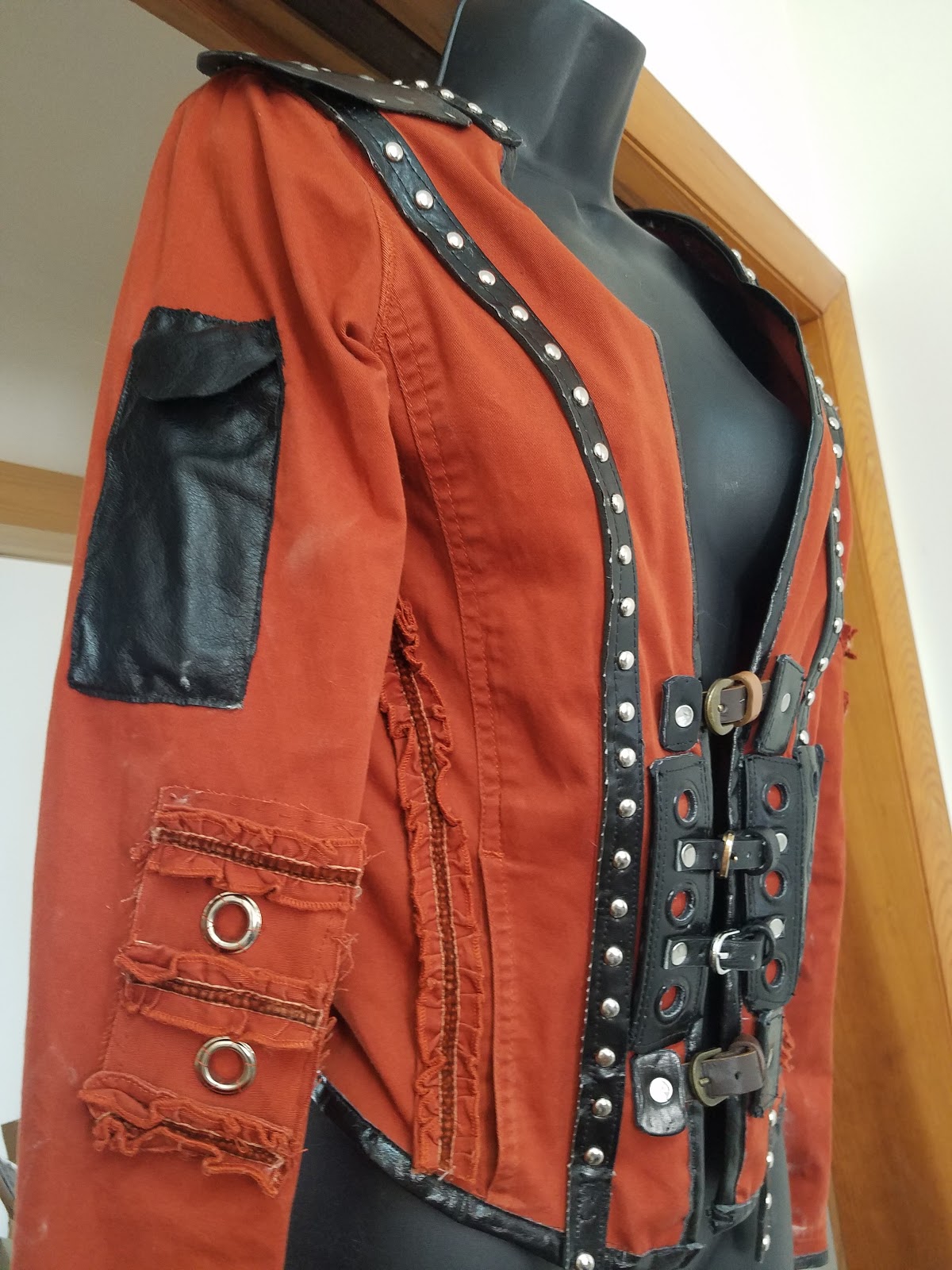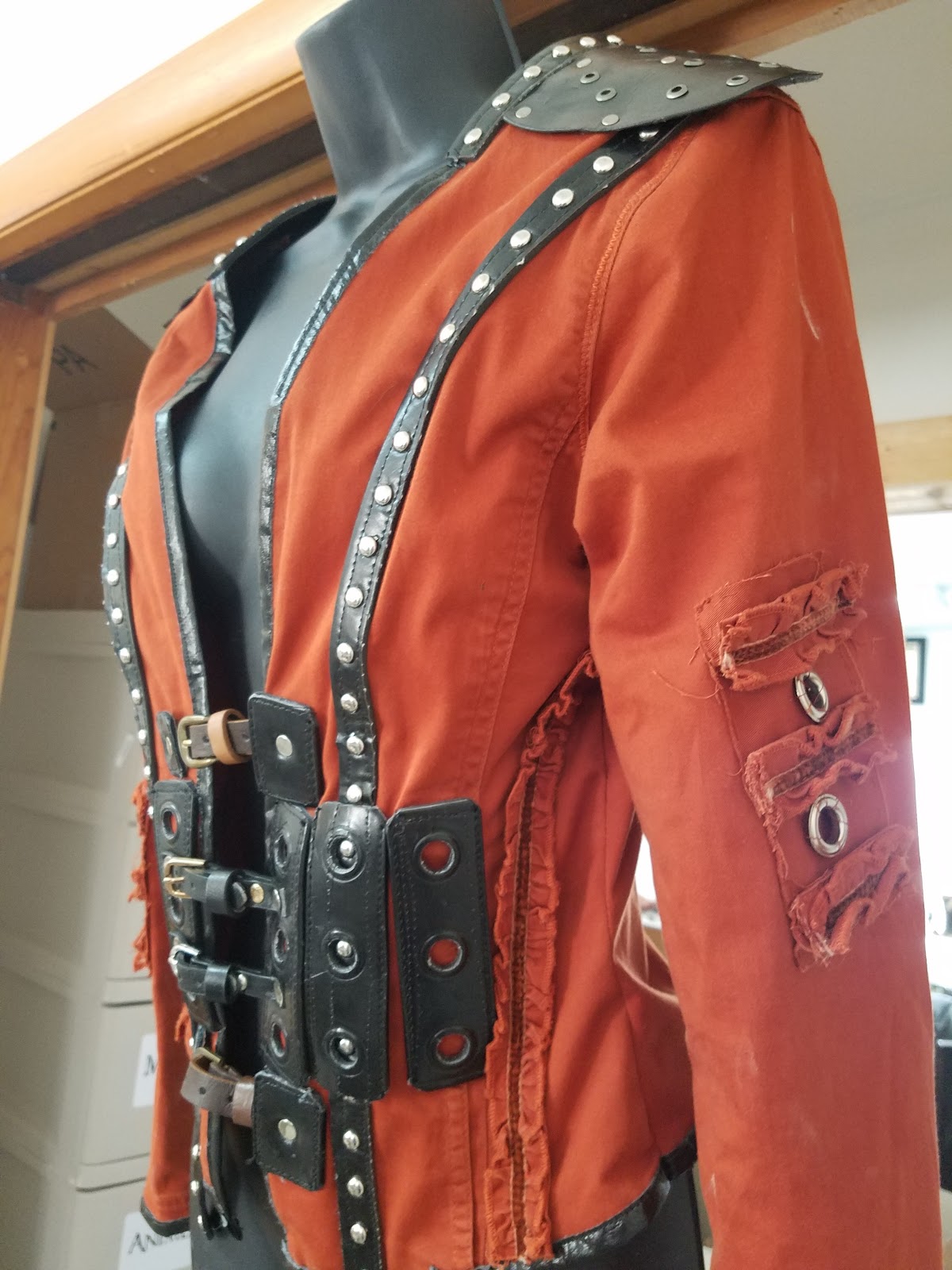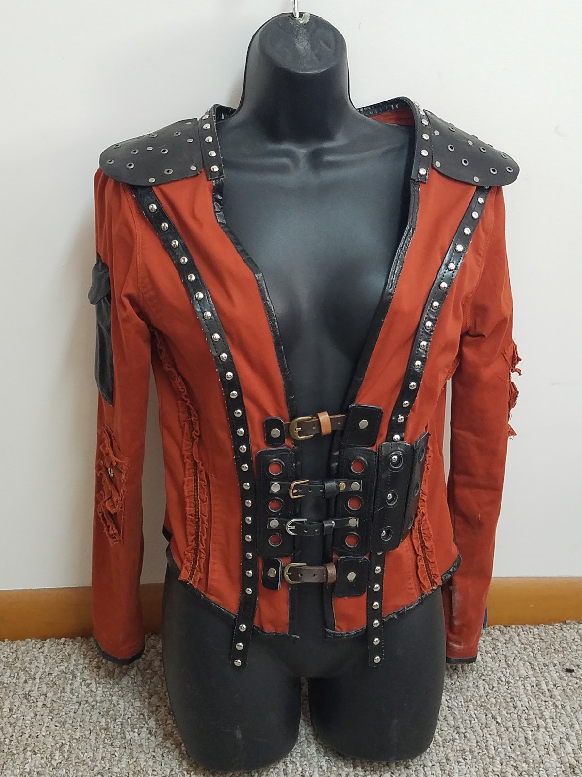 My version of Eretria’s jacket isn’t exactly like the one on The Shannara Chronicles, but I’m fine with that. Some of the details are a little different such as the buckles in the front. I did a mix of black and brown leather because she’s a rover and Eretria’s going to use whatever she can find or steal to make her clothing! The studded detail down the front was made using a wide belt from Goodwill that I cut in half longways. I used the leather belt that I ripped the eyelets out of to make a support for the buckles. The black pouch on the sleeve was made using scrap leather I had from another project. Here is my version of her jacket: