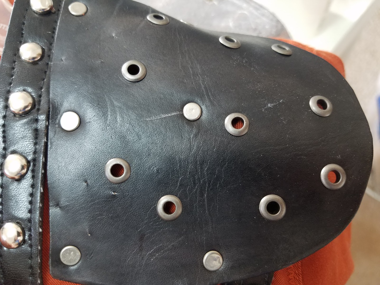 For the shoulder armor, I started with veg-tan leather scraps I had lying around. I dyed them black and decorated it with a lot of rivets and eyelets like these below. I saved a few spots on the leather to use the rivets to connect the leather armor to the jacket.