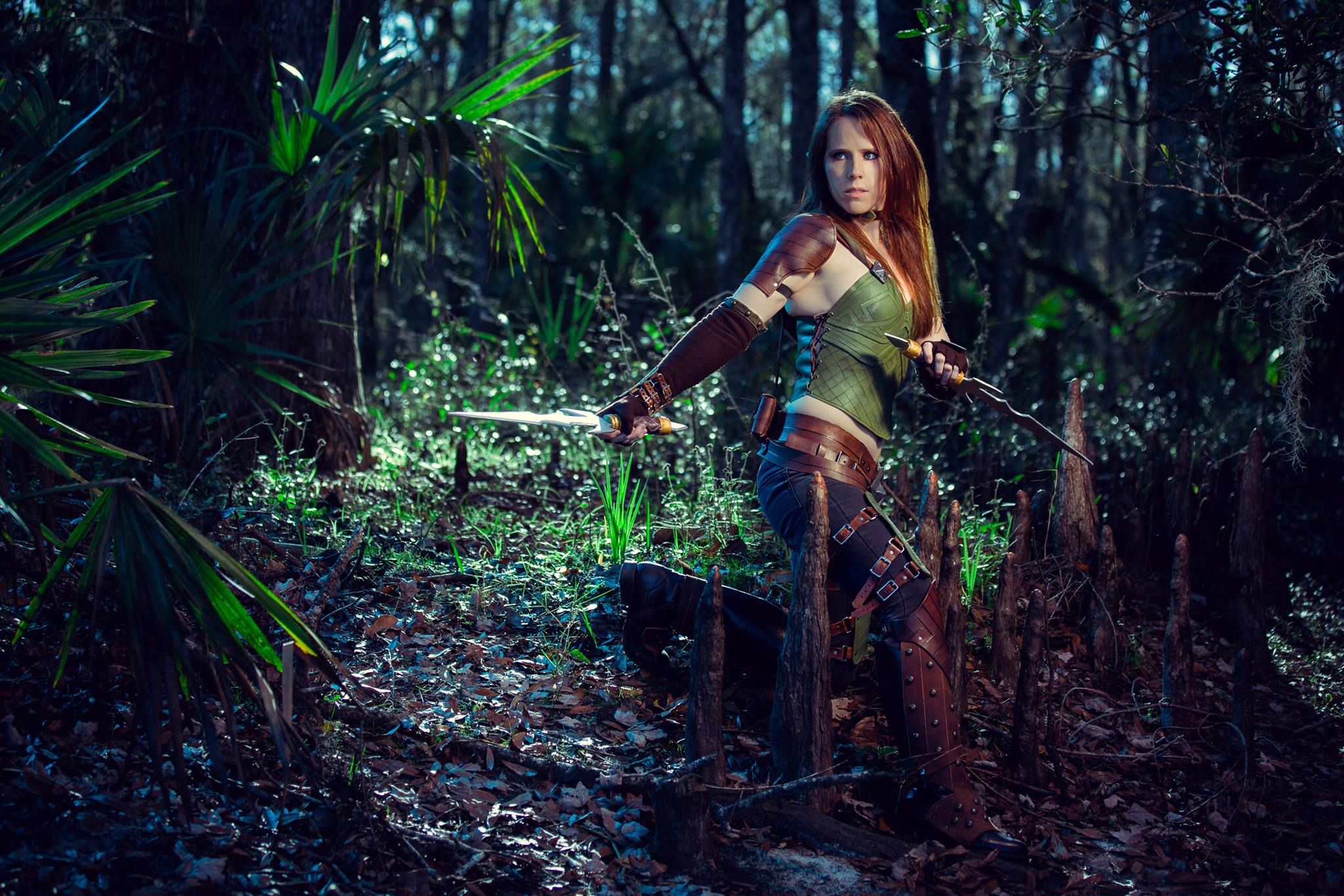 The daggers were carved from wood. The belt buckle, shoulder clasps and choker jewel were made all from worbla. The boot covers were made from oil tan leather and covered with antique brass spots. Lastly, the hood was made from faux suede.I had a few issues with this costume the first time I wore it. The chest piece was tremendously uncomfortable. I actually ended up bruising my ribcage. I have since discovered pig leather, which is much softer and can still be carved. I remade the back piece and then the costume was much more tolerable and yay no bruises.