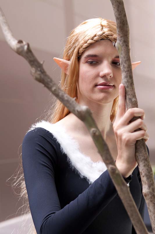 I costumed as Aroree back in 2009 at Dragon con with a group of other Elfquest costumers. I chose Aroree not only because my body type fit the character very well, but also because of her character development in the series . I decided to do one of the alternate costumes of her from later in the series. The elf ears, of course I got from Aradani, and the costume itself is two parts – the top was a leotard and the bottom was a pair of spandex pants. I purchased both of them as at the time my sewing skills where not what they are now. However I did hand paint the detail on the pants as well as glue the faux fur trim on the collar and around the bottom of the leotard. The wig I also styled myself, it being made of two parts – that being the main wig and the braid. The braid was excess hair cut from the wig, braided and put onto a hairband. The makeup was simple I just went for a natural look and I did do a little accent to my eyes.
