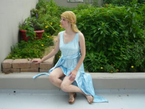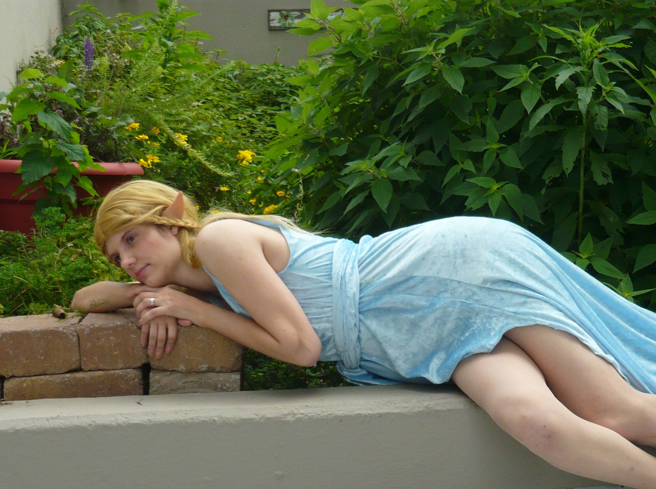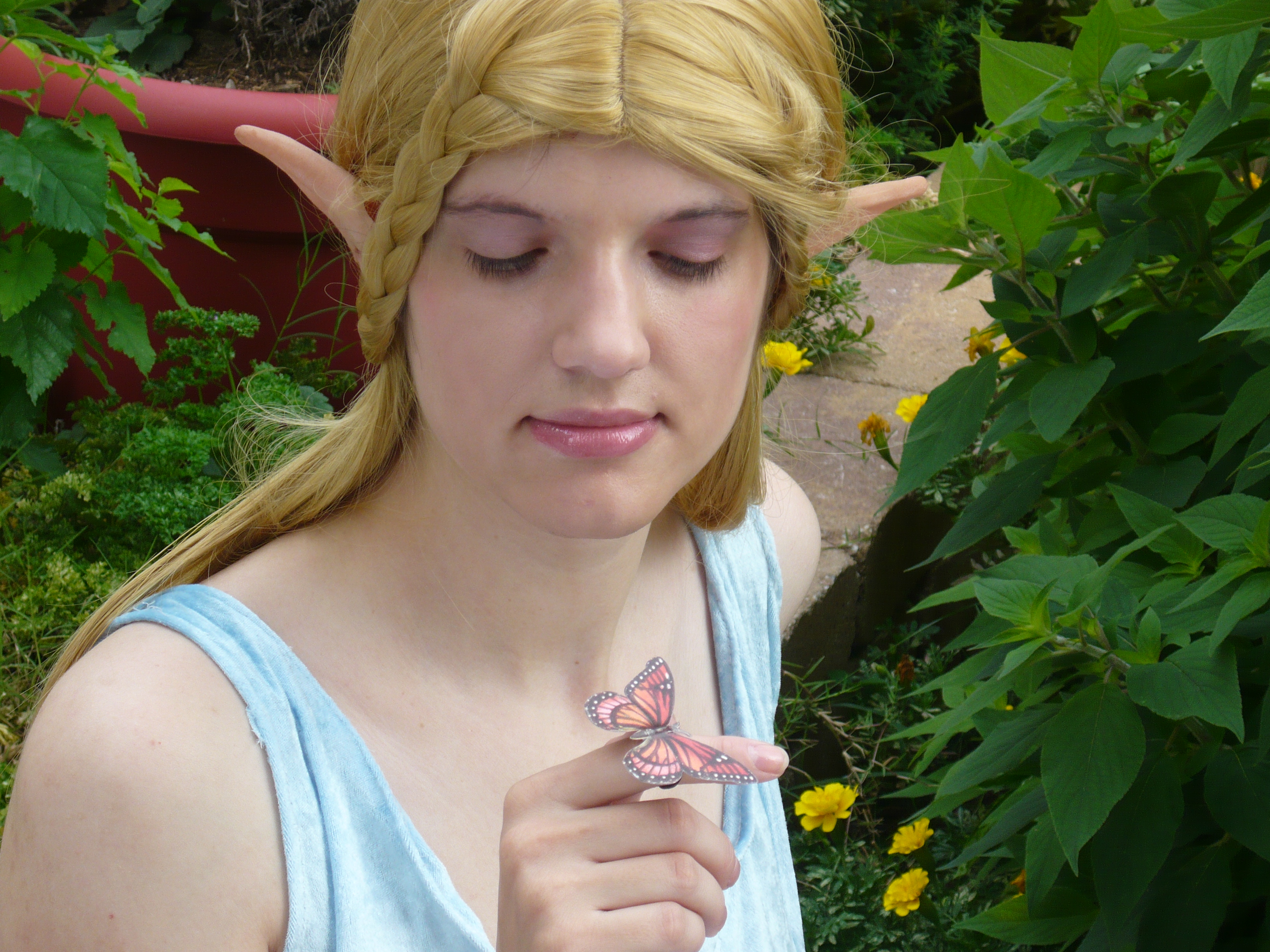 Newstar was a different process, I costumed her because this past Dragon*con the creators of Elfquest would be in attendance and I could not pass the opportunity to meet them and costume as one of the characters again. I chose Newstar for a similar reason I chose to do Aroree – that being her body type fit me well and because she is one of the most beautiful characters in the series. She was also dubbed by the creators to be the “elfiest elf”. I used the same anime elf ears again for this costume. The dress was velvet and was something I had used in a couple different costumes already but I decided to alter the dress into what it currently is now. In the series, the elves in that part of the world wear clothing of a fine “moth” fabric. I could have gone with a sheer chiffon, but as I had already stated – I had something on hand to work with. I am very pleased with the results, the sky blue velvet looks like a liquid jewel flowing around me and I think it worked well showcasing the beauty of the character. The wig I styled by just doing two simple braid loops to the side and then tying them together with a hair tie. For a small bit of added detail, I had purchased a hair tie that had little white flowers and clear crystal jewels in them. I thought it would be a nice touch to the costume. Also for a final touch, I made a little butterfly prop to illustrate peace and serenity.
