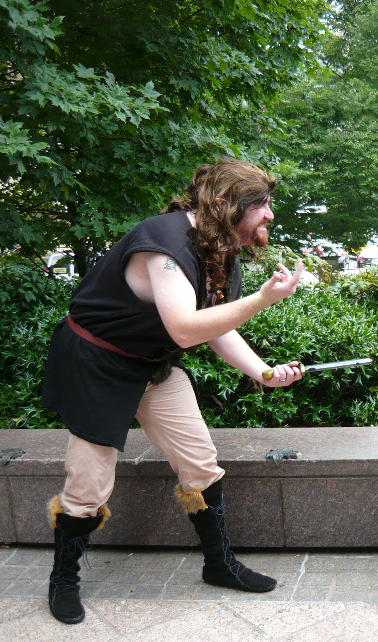 For my Husband, I had requested he dress as Bearclaw, because I liked the character. He is very cunning and well… not to bad to look at. For his costume we used the large elf ears mostly because they could fit my husbands ears well. For the costume I made him a tunic out of simple knit fabric for comfort and also so he did not over heat. I glued on the fir trim myself and he added the trim to a pair of moccasins. He already owned the belt and the cotton pants, but I did dye the pants to make them a bit more tan and because it also added a bit of texture to the look of the pants. The wig we bought and styled ourselves and the necklace was made from a large claw and cord from Tandy Leather.