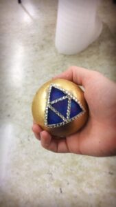 I used some old white shoes that I had, and painted them gold, and glued on some of the same rhinestones that I used on the gloves. I also added one of the pearl buttons again, and they ended up looking really cute and they fitted the rest of the outfit. It was really hard to find any pictures of the shoes since they’re barely visible, so I added some details I felt looked good with the costume.