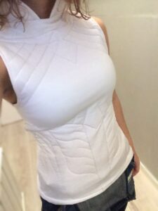 The white top was so much fun to make! On the design, she has this quilted pattern on the front and the back, so I sowed together two pieces of the fabric, and put some of that thin cotton type of fabric in between to give more dimension when I was going to sow on the pattern. I drew the pattern design on some paper, pinned it directly on the top, and followed the lines with my sowing machine. When I had sown all the lines, I ripped the paper off, and the pattern looked perfect on the top! It was just like drawing with a sowing machine, and it was so much fun to do! At the end, I added a collar, and sowed on a little button which had some pearls and gold details to make it look even more “princessy”