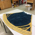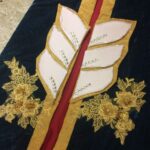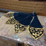 Since it looks kind of 3D on the design, I decided to make them in 5mm foam, which I then glued on the same gold stretch fabric as the tabbern belt. I directly glued it on the blue fabric, which was really scary since I hadn’t done that before, and I didn’t really knew if it was going to work or not. Luckily, it ended up looking really nice, so I was pretty pleased with that! I then sewed on the gold bias tape I had made earlier, and then attached some more gold lace on the sleeves.
