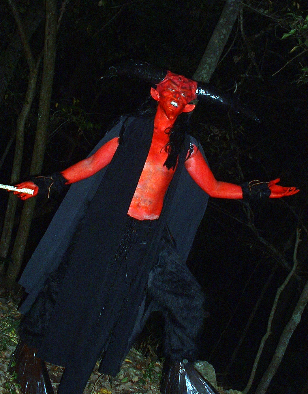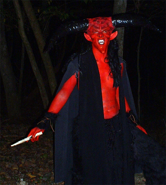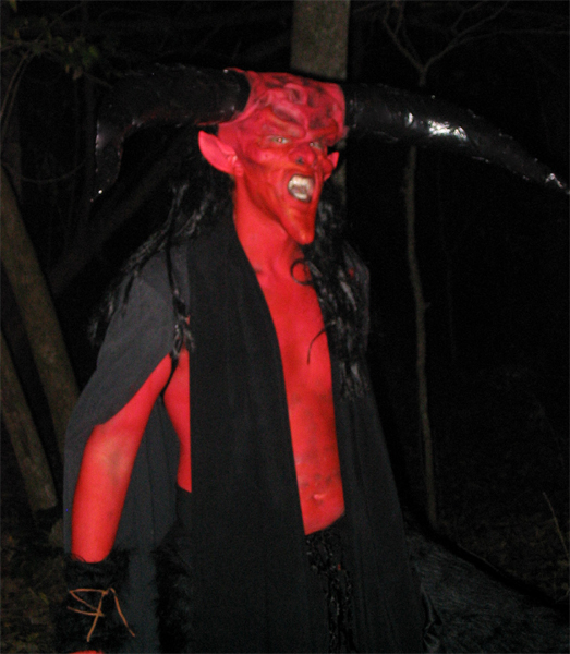 The horns were the most difficult to produce, and the most painful part of the costume. My horns were too heavy, and thus pushed against my temples all night. It is very important to build and design light weight horns. Aradani Studios is currently working on producing a pair, but until they are ready, make sure the horns that you make are light. I suggest making a headband with the horns attached to it, with a cross band going from horn to horn (ear to ear over your head).