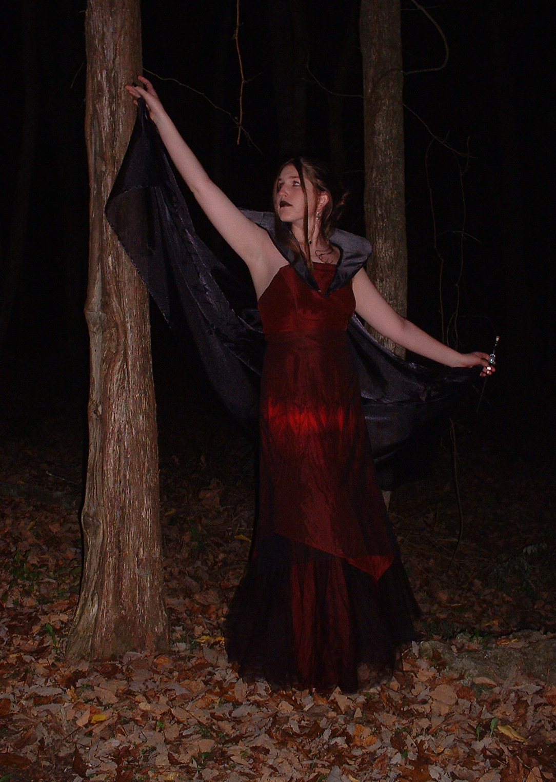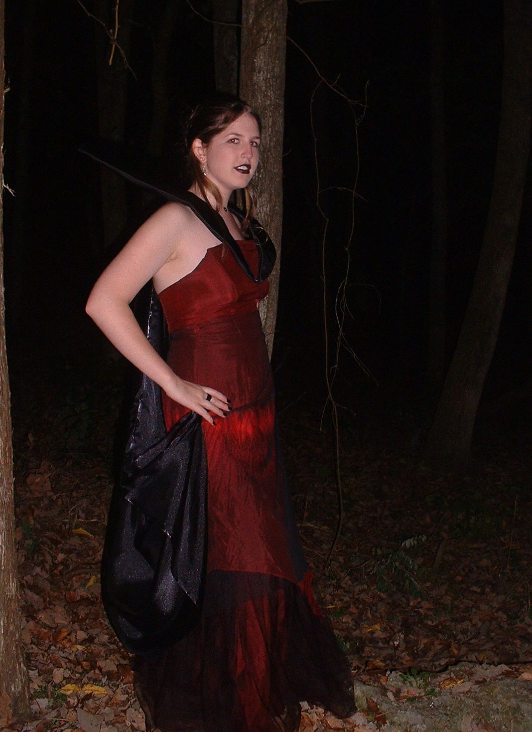 My sister Sara dressed the part of Lily. Her dress was a thrift store find, converted with a special collar. Grab some black lipstick, and add a simple black half-cloak and you are done.