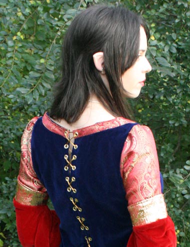 In this next photo you can see the small elf ears I am wearing. The elf ears are also available at aradanicostumes.com for $15.00 plus shipping. The back detailing on this dress is what Mike and I decided would make the piece more period. I was going to put a zipper in, but we thought the large eyelets would be a nice touch. You can also clearly see the gold and red detailing of the arms and upper back.