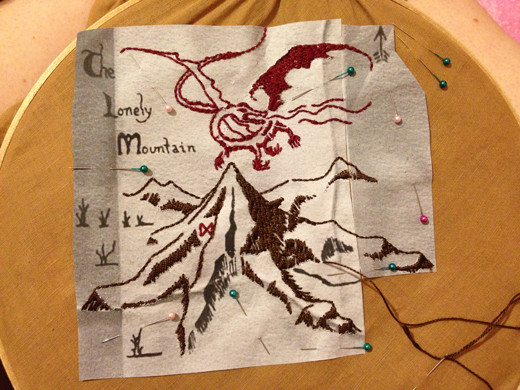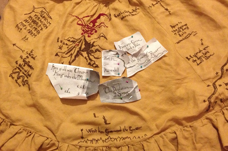 For the embroidery, I found a high-quality print of the map online (actually a fan replica), enlarged it, and printed it out. Since the skirt curves and the map doesn’t, I had to arrange the pieces carefully and extend a few rivers and trees to keep the general lay-out correct. I stitched right through the paper stencil onto the fabric, which resulted in a lot of time picking out bits of paper (I’m still trying to get it out of Smaug’s wing), but it was the best way I could figure out. The first time I wore it was Dragon*Con, and I didn’t have enough time to finish the whole thing, so I started with the Lonely Mountain and Smaug, since they’re the focus of the map. That took about 10 hours of work. It went over very well at the convention, which gave me to energy to keep going. In all, it was about 52 hours of work to get the whole map on there.