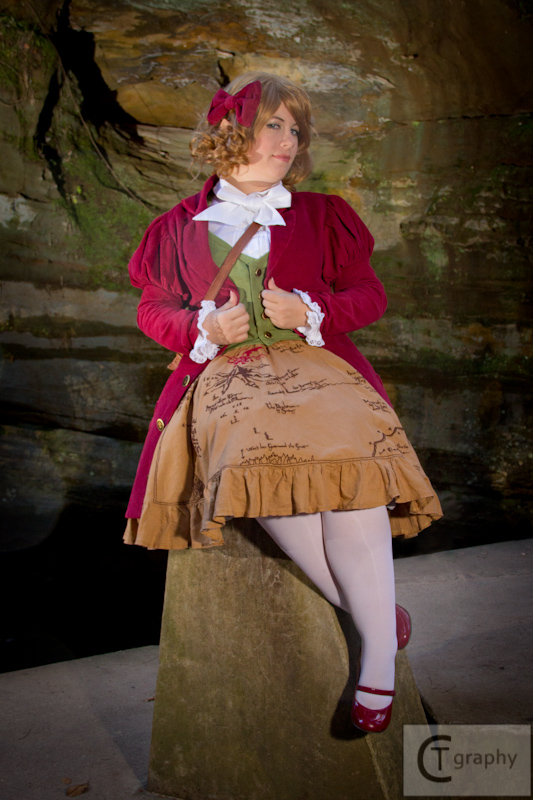 When I was waffling about which dwarf I should try to replicate, my friends showed me some designs by an artist on Tumblr. She had taken the outfits and styling of the characters from The Hobbit and changed them into Lolita fashion. I’ve never really been one for Lolita, but the thought of having Thror’s map on a skirt was too much for me to pass up. Since I was already taking creative liberty with the character, I had fun embellishing the existing design for Bilbo.