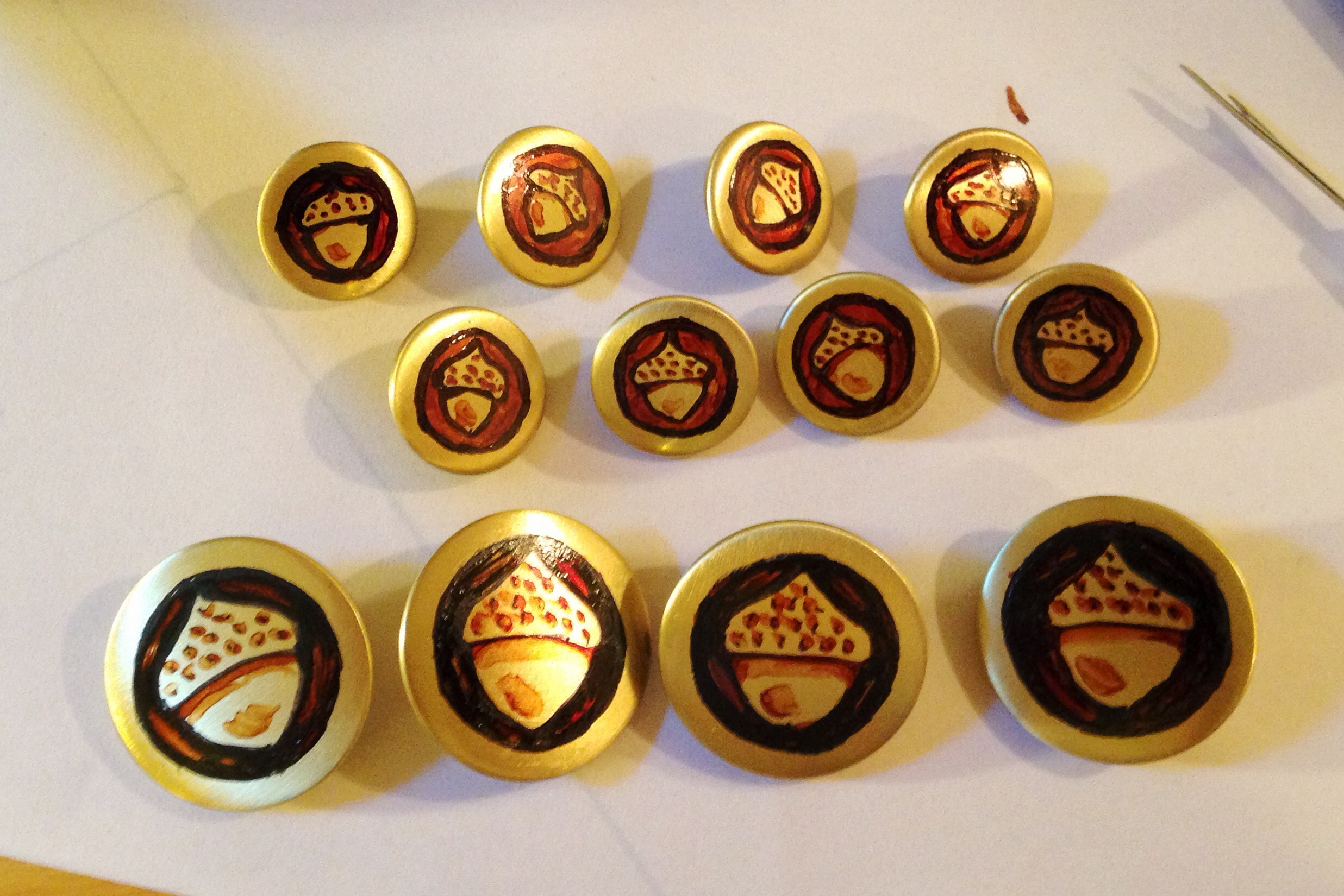 Bilbo has beautiful little acorn buttons, but they don’t seem to exist in real life for purchase. I was going to try to get my friend to mold and cast them for me, when she suggested a simpler solution, and simply painted the design on with markers and sealed them with Mod-Podge. I love helping out friends with bits on their costumes, when it means I get little favors like that in return.