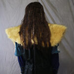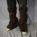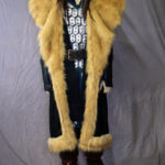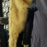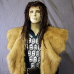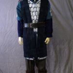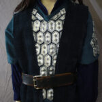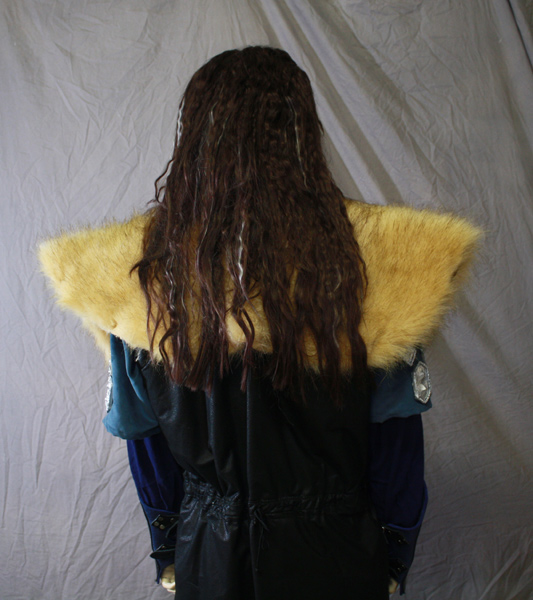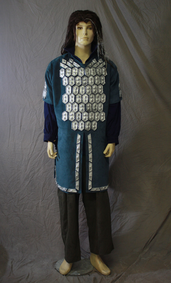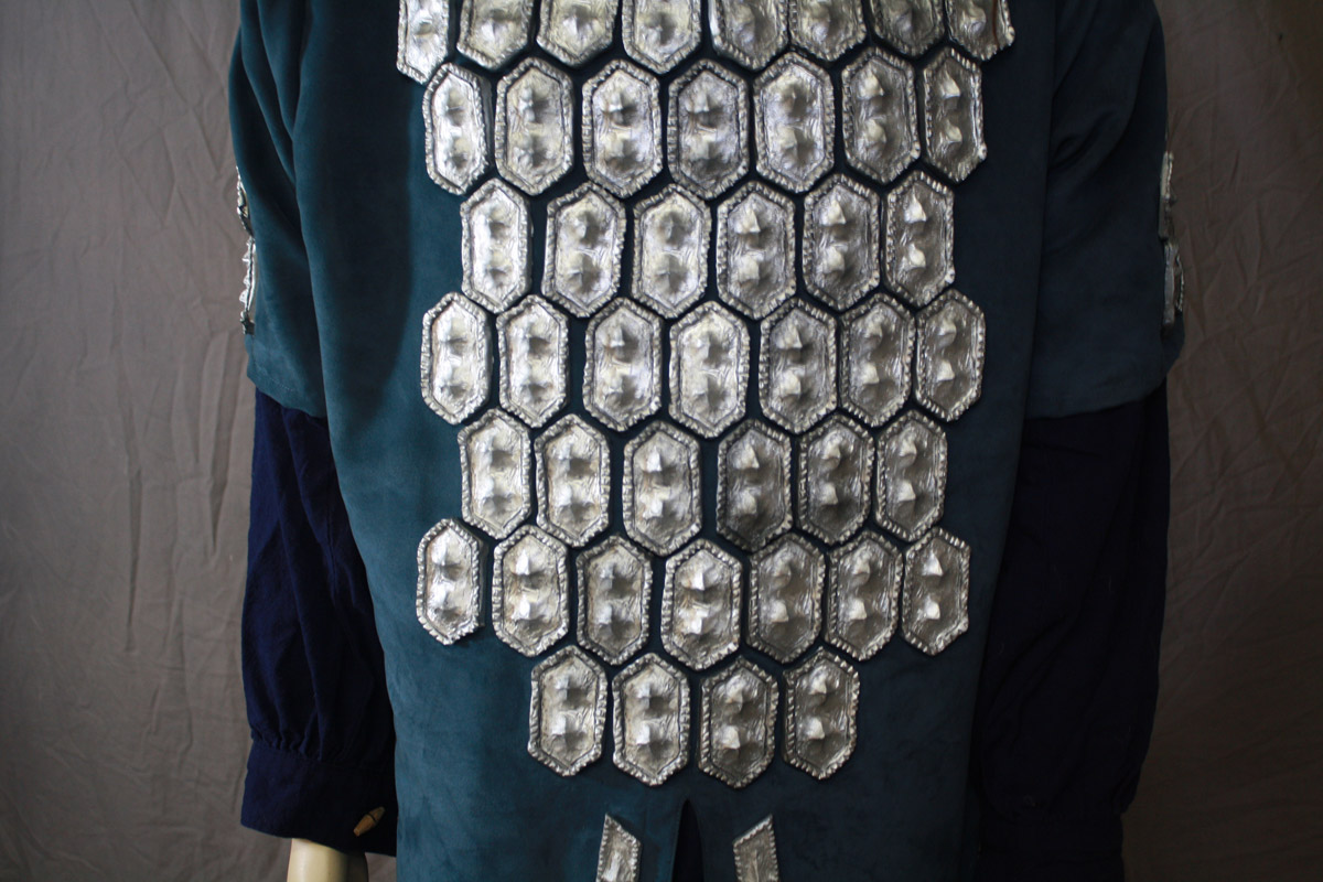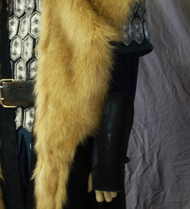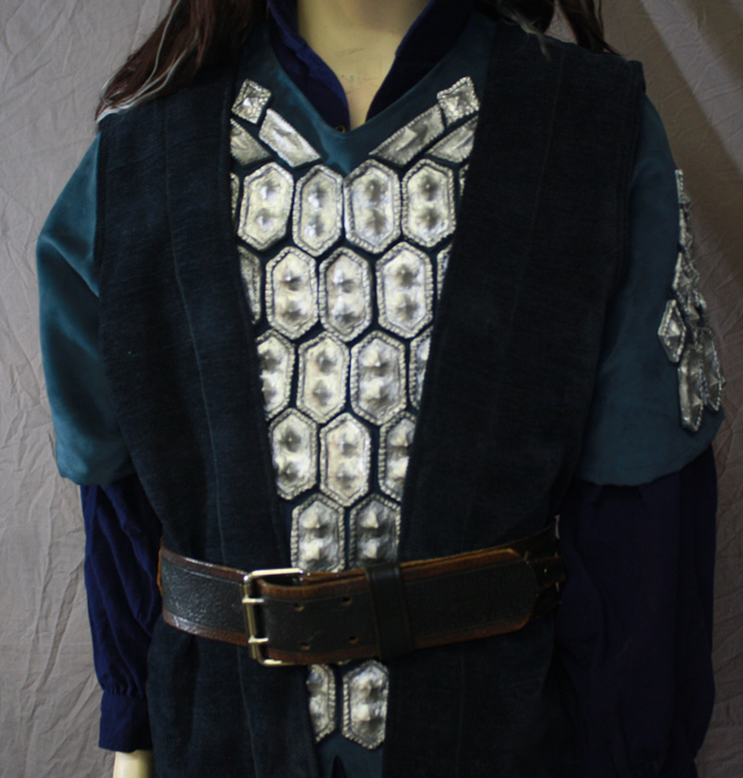 The underlayer of the costume is made of a loose knit cotton. The scalemail is a mix of costume cast plastic armor and faux suede. The undervest is made from blue upholstery and the outer vest is faux leather and faux fur.