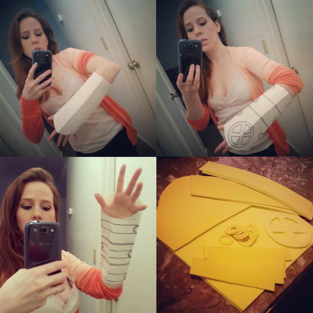 This costume was slightly challenging for me because I had never made a full bodysuit before. I learned a lot about working with spandex. I choose a wet look spandex because I wanted it to look slightly leatherish. Sewing spandex to spandex and trying to keep nice straight lines was pretty tough, but I finally pulled it off. I used the left over yellow spandex for the belt strap and lined it with a heavy duty interfacing. The belt buckle is a foam base covered with worbla and I glued a parachute buckle to the back to hold it together. The gauntlets are also a foam from worbla. The base boot are galoshes. The additions are foam painted with plastidip. We didn’t use worbla for the full boots because we wanted them to be flexible. The plugs on the ankle are worbla however. I had a lot of fun making and wearing this costume. I am not sure if I’ll ever retire it.