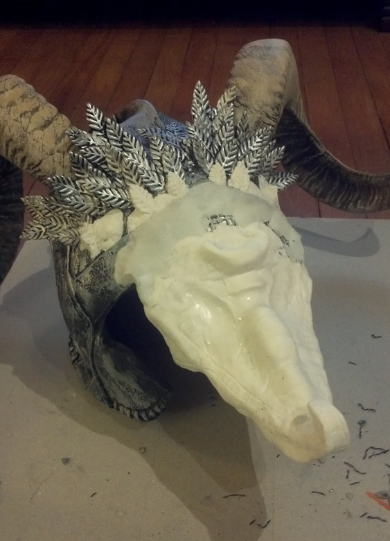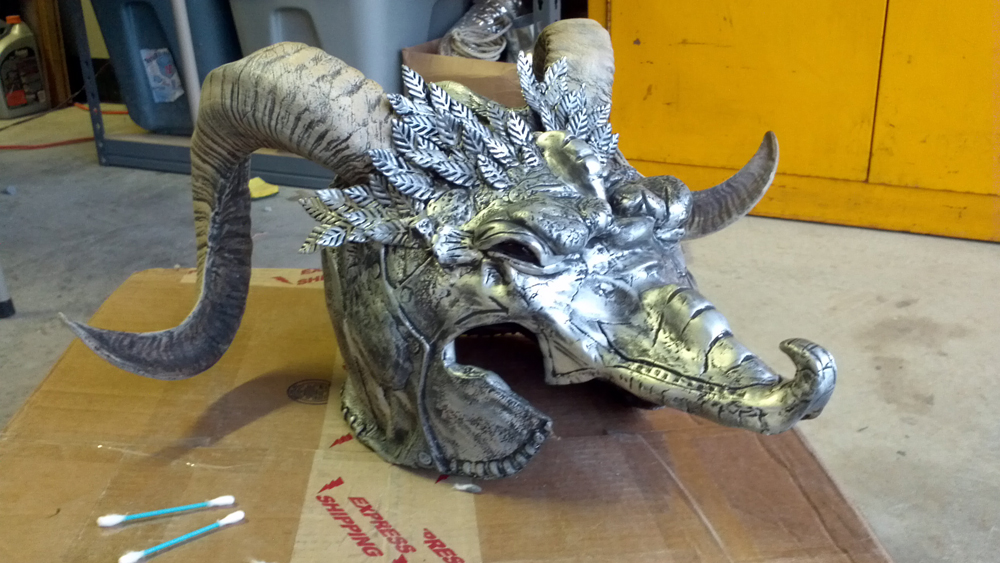 At this point, I used some metal leaves (from my original Crown of Swords!) and screwed/bolted those onto the helmet hiding the base of the horns. You can see in Darrell’s art the flowery petals that I was imitating in front of the horns. I then used Magic Sculpt, an extremely strong 2 part compound to make the cheek guards, and to bridge the space between the metal leaves and the Model Magic snout.
